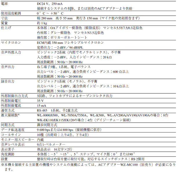業務用途を目的としたマルチリモコンマイクです。ラック形非常用放送設備WL-8000シリーズ、ラック形非常用放送設備WL-7050A/7550A、壁掛形非常用放送設備WK-EK110/EK115/EK120、システムコントローラーWL-K500、AVステーションWL-AV190A/AV190/AV200Aに接続できます。WL-8000シリーズでは、20のブロック放送、一斉放送および最大340回線の個別放送ができます。【付属品】 束線バンド×3、風防(取付け済み)×1、取扱説明書、保証書